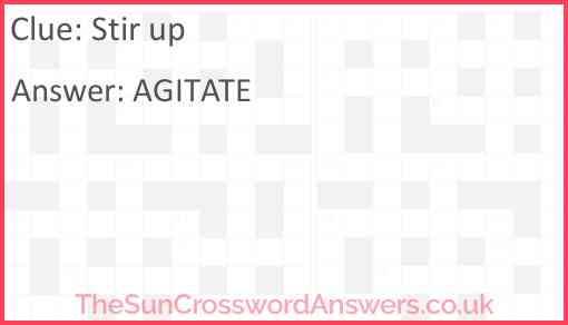 Stir up is a crossword clue for which we have 1 possible answer and we have spotted 9 times in our database. This crossword clue was last seen on 28 October 2024 in The Sun Coffee Time Crossword puzzle!
