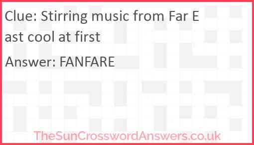Stirring music from Far East cool at first is a crossword clue for which we have 1 possible answer and we have spotted 1 times in our database. This crossword clue was last seen on 29 August 2022 in The Sun Cryptic Crossword puzzle!