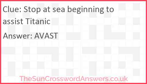Stop at sea beginning to assist Titanic is a crossword clue for which we have 1 possible answer and we have spotted 1 times in our database. This crossword clue was last seen on 17 June 2024 in The Sun Cryptic Crossword puzzle!