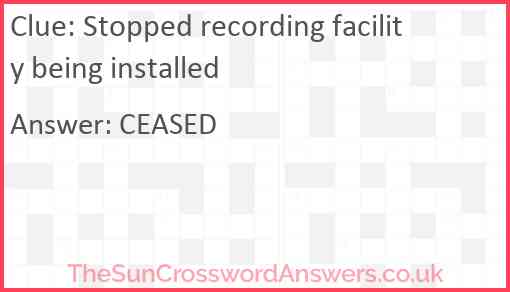 Stopped recording facility being installed is a crossword clue for which we have 1 possible answer and we have spotted 2 times in our database. This crossword clue was last seen on 28 April 2024 in The Sun Cryptic Crossword puzzle!