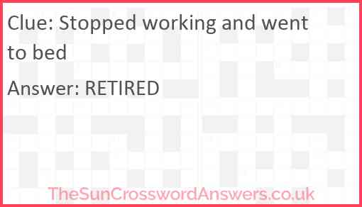 Stopped working and went to bed is a crossword clue for which we have 1 possible answer and we have spotted 2 times in our database. This crossword clue was last seen on 07 March 2022 in The Sun Cryptic Crossword puzzle!