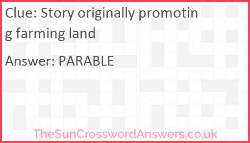 Story originally promoting farming land is a crossword clue for which we have 1 possible answer and we have spotted 2 times in our database. This crossword clue was last seen on 25 January 2025 in The Sun Cryptic Crossword puzzle!