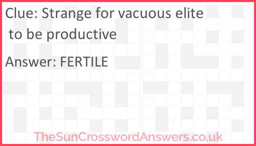 Strange for vacuous elite to be productive is a crossword clue for which we have 1 possible answer and we have spotted 2 times in our database. This crossword clue was last seen on 24 June 2022 in The Sun Cryptic Crossword puzzle!