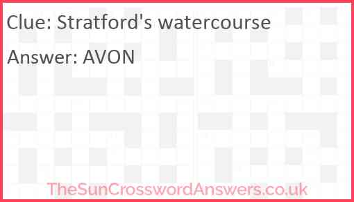 Stratford's watercourse is a crossword clue for which we have 1 possible answer and we have spotted 3 times in our database. This crossword clue was last seen on 02 January 2021 in The Sun Coffee Time Crossword puzzle!