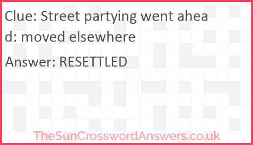 Street partying went ahead: moved elsewhere is a crossword clue for which we have 1 possible answer and we have spotted 1 times in our database. This crossword clue was last seen on 12 July 2024 in The Sun Cryptic Crossword puzzle!