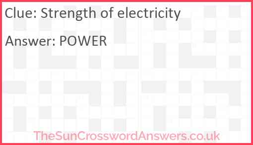 Strength of electricity is a crossword clue for which we have 1 possible answer and we have spotted 1 times in our database. This crossword clue was last seen on 20 December 2020 in The Sun Cryptic Crossword puzzle!