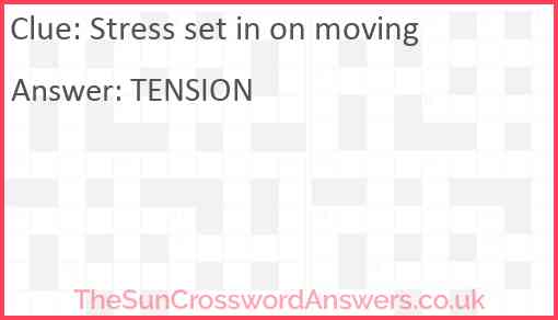 Stress set in on moving is a crossword clue for which we have 1 possible answer and we have spotted 1 times in our database. This crossword clue was last seen on 25 October 2021 in The Sun Cryptic Crossword puzzle!