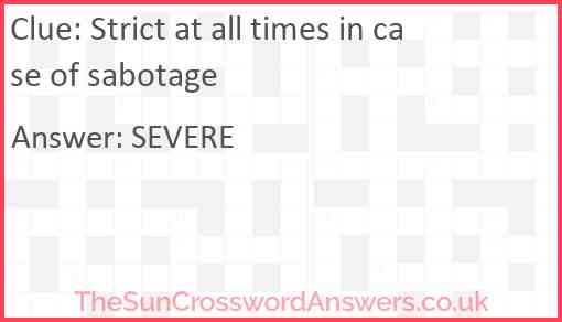 Strict at all times in case of sabotage is a crossword clue for which we have 1 possible answer and we have spotted 2 times in our database. This crossword clue was last seen on 09 October 2024 in The Sun Cryptic Crossword puzzle!