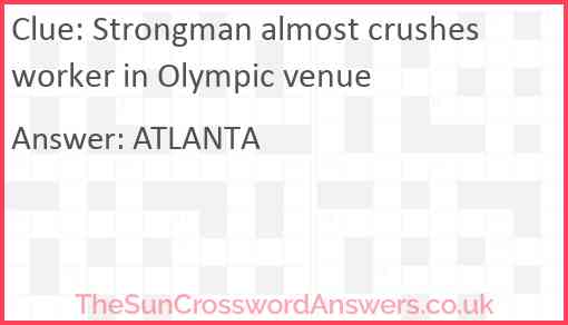 Strongman almost crushes worker in Olympic venue is a crossword clue for which we have 1 possible answer and we have spotted 1 times in our database. This crossword clue was last seen on 08 February 2022 in The Sun Cryptic Crossword puzzle!