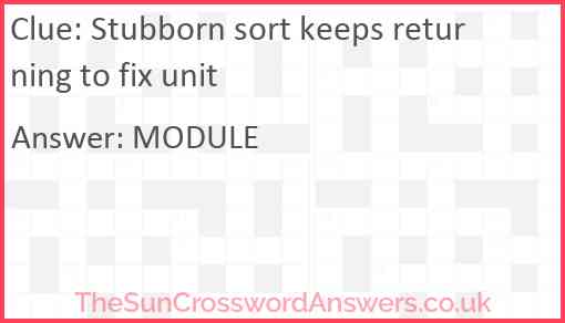 Stubborn sort keeps returning to fix unit is a crossword clue for which we have 1 possible answer and we have spotted 1 times in our database. This crossword clue was last seen on 19 December 2023 in The Sun Cryptic Crossword puzzle!