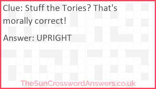 Stuff the Tories? That's morally correct! is a crossword clue for which we have 1 possible answer and we have spotted 1 times in our database. This crossword clue was last seen on 12 July 2021 in The Sun Cryptic Crossword puzzle!