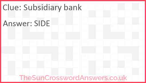 Subsidiary bank is a crossword clue for which we have 1 possible answer and we have spotted 1 times in our database. This crossword clue was last seen on 25 November 2024 in The Sun Cryptic Crossword puzzle!