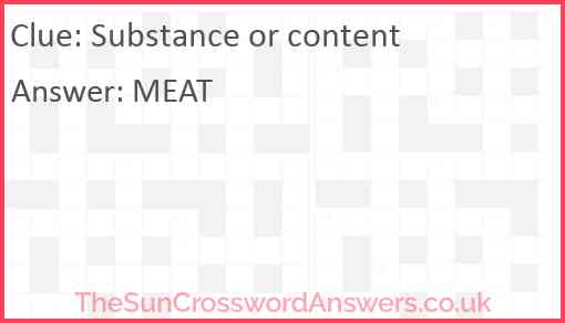 Substance or content is a crossword clue for which we have 1 possible answer and we have spotted 5 times in our database. This crossword clue was last seen on 09 June 2025 in The Sun Coffee Time Crossword puzzle!