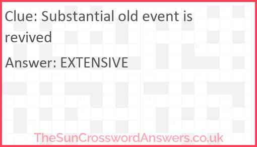 Substantial old event is revived is a crossword clue for which we have 1 possible answer and we have spotted 2 times in our database. This crossword clue was last seen on 07 December 2023 in The Sun Cryptic Crossword puzzle!