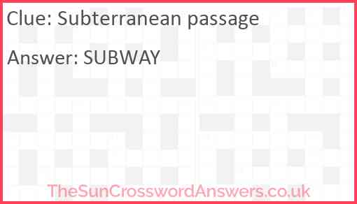 Subterranean passage is a crossword clue for which we have 1 possible answer and we have spotted 3 times in our database. This crossword clue was last seen on 02 November 2024 in The Sun Coffee Time Crossword puzzle!