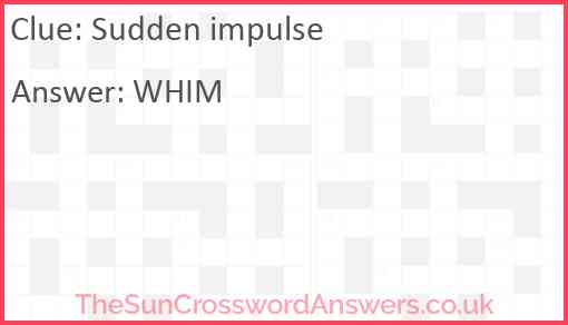 Sudden impulse is a crossword clue for which we have 1 possible answer and we have spotted 1 times in our database. This crossword clue was last seen on 28 June 2019 in The Sun Coffee Time Crossword puzzle!