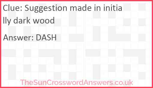 Suggestion made in initially dark wood is a crossword clue for which we have 1 possible answer and we have spotted 2 times in our database. This crossword clue was last seen on 20 May 2024 in The Sun Cryptic Crossword puzzle!