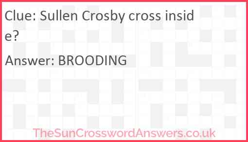 Sullen Crosby cross inside is a crossword clue for which we have 1 possible answer and we have spotted 2 times in our database. This crossword clue was last seen on 13 May 2024 in The Sun Cryptic Crossword puzzle!