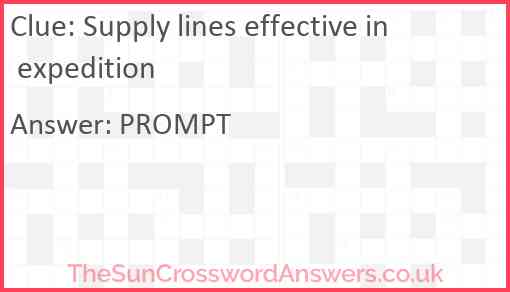 Supply lines effective in expedition is a crossword clue for which we have 1 possible answer and we have spotted 1 times in our database. This crossword clue was last seen on 08 February 2022 in The Sun Cryptic Crossword puzzle!