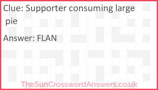 Supporter consuming large pie is a crossword clue for which we have 1 possible answer and we have spotted 3 times in our database. This crossword clue was last seen on 01 July 2022 in The Sun Cryptic Crossword puzzle!