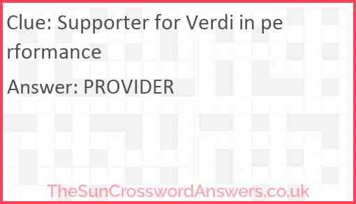Supporter for Verdi in performance is a crossword clue for which we have 1 possible answer and we have spotted 2 times in our database. This crossword clue was last seen on 04 June 2023 in The Sun Cryptic Crossword puzzle!