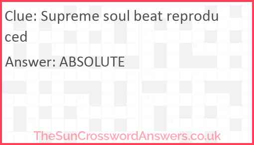 Supreme soul beat reproduced is a crossword clue for which we have 1 possible answer and we have spotted 2 times in our database. This crossword clue was last seen on 16 June 2024 in The Sun Cryptic Crossword puzzle!