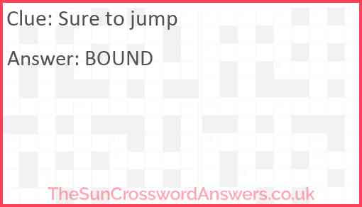 Sure to jump is a crossword clue for which we have 1 possible answer and we have spotted 3 times in our database. This crossword clue was last seen on 30 October 2022 in The Sun Cryptic Crossword puzzle!