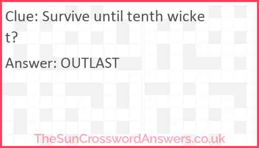 Survive until tenth wicket? is a crossword clue for which we have 1 possible answer and we have spotted 2 times in our database. This crossword clue was last seen on 21 May 2023 in The Sun Cryptic Crossword puzzle!
