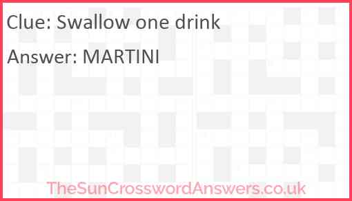 Swallow one drink is a crossword clue for which we have 1 possible answer and we have spotted 4 times in our database. This crossword clue was last seen on 27 August 2023 in The Sun Cryptic Crossword puzzle!