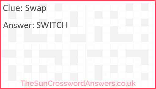 Swap is a crossword clue for which we have 1 possible answer and we have spotted 1 times in our database. This crossword clue was last seen on 16 July 2019 in The Sun Coffee Time Crossword puzzle!