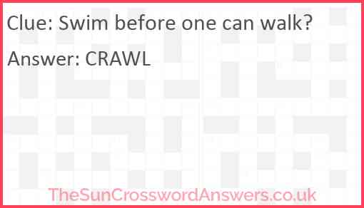 Swim before one can walk? is a crossword clue for which we have 1 possible answer and we have spotted 1 times in our database. This crossword clue was last seen on 04 October 2021 in The Sun Cryptic Crossword puzzle!