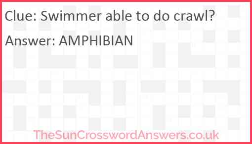 Swimmer able to do crawl? is a crossword clue for which we have 1 possible answer and we have spotted 1 times in our database. This crossword clue was last seen on 23 April 2021 in The Sun Cryptic Crossword puzzle!