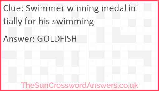 Swimmer winning medal initially for his swimming is a crossword clue for which we have 1 possible answer and we have spotted 1 times in our database. This crossword clue was last seen on 02 February 2022 in The Sun Cryptic Crossword puzzle!