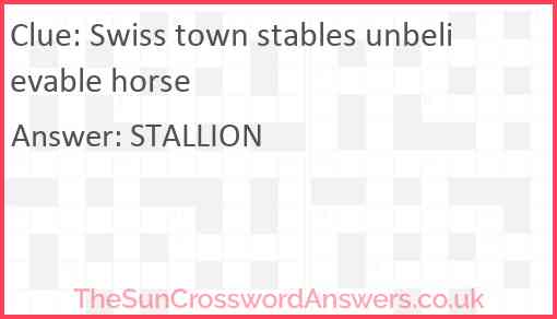 Swiss town stables unbelievable horse is a crossword clue for which we have 1 possible answer and we have spotted 1 times in our database. This crossword clue was last seen on 23 July 2024 in The Sun Cryptic Crossword puzzle!