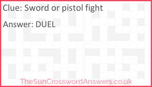 Sword or pistol fight is a crossword clue for which we have 1 possible answer and we have spotted 3 times in our database. This crossword clue was last seen on 22 April 2025 in The Sun Coffee Time Crossword puzzle!