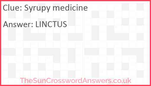 Syrupy medicine is a crossword clue for which we have 1 possible answer and we have spotted 2 times in our database. This crossword clue was last seen on 10 October 2022 in The Sun Coffee Time Crossword puzzle!