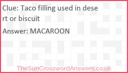 Taco filling used in desert or biscuit is a crossword clue for which we have 1 possible answer and we have spotted 1 times in our database. This crossword clue was last seen on 27 December 2022 in The Sun Cryptic Crossword puzzle!