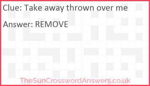 Take away thrown over me is a crossword clue for which we have 1 possible answer and we have spotted 1 times in our database. This crossword clue was last seen on 03 July 2021 in The Sun Cryptic Crossword puzzle!