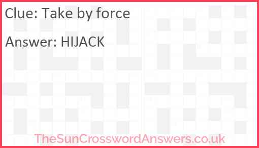 Take by force is a crossword clue for which we have 1 possible answer and we have spotted 3 times in our database. This crossword clue was last seen on 25 January 2023 in The Sun Coffee Time Crossword puzzle!