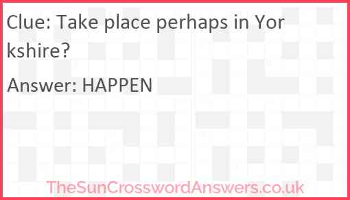 Take place perhaps in Yorkshire? is a crossword clue for which we have 1 possible answer and we have spotted 4 times in our database. This crossword clue was last seen on 21 May 2025 in The Sun Cryptic Crossword puzzle!