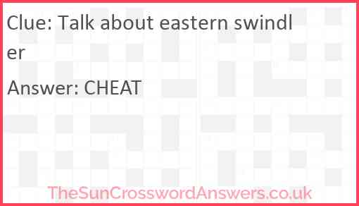 Talk about eastern swindler is a crossword clue for which we have 1 possible answer and we have spotted 2 times in our database. This crossword clue was last seen on 03 October 2024 in The Sun Cryptic Crossword puzzle!