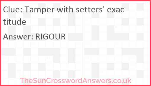 Tamper with setters' exactitude is a crossword clue for which we have 1 possible answer and we have spotted 1 times in our database. This crossword clue was last seen on 04 December 2022 in The Sun Cryptic Crossword puzzle!