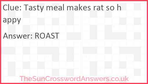 Tasty meal makes rat so happy is a crossword clue for which we have 1 possible answer and we have spotted 2 times in our database. This crossword clue was last seen on 29 January 2025 in The Sun Cryptic Crossword puzzle!