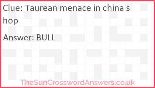 Taurean menace in china shop is a crossword clue for which we have 1 possible answer and we have spotted 4 times in our database. This crossword clue was last seen on 16 July 2025 in The Sun Cryptic Crossword puzzle!