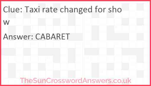 Taxi rate changed for show is a crossword clue for which we have 1 possible answer and we have spotted 1 times in our database. This crossword clue was last seen on 06 September 2022 in The Sun Cryptic Crossword puzzle!
