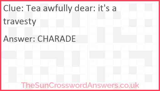 Tea awfully dear: it's a travesty is a crossword clue for which we have 1 possible answer and we have spotted 2 times in our database. This crossword clue was last seen on 02 August 2025 in The Sun Cryptic Crossword puzzle!
