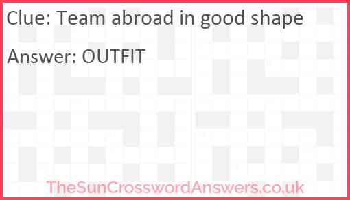 Team abroad in good shape is a crossword clue for which we have 1 possible answer and we have spotted 3 times in our database. This crossword clue was last seen on 14 May 2024 in The Sun Cryptic Crossword puzzle!