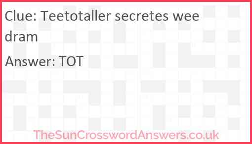Teetotaller secretes wee dram is a crossword clue for which we have 1 possible answer and we have spotted 3 times in our database. This crossword clue was last seen on 30 June 2022 in The Sun Cryptic Crossword puzzle!