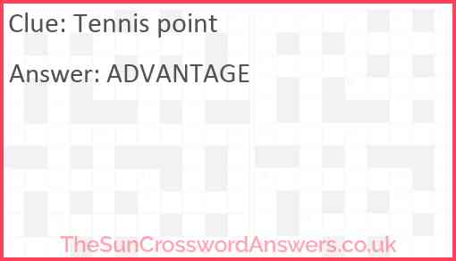 Tennis point is a crossword clue for which we have 1 possible answer and we have spotted 14 times in our database. This crossword clue was last seen on 10 April 2025 in The Sun Coffee Time Crossword puzzle!