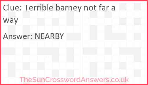 Terrible barney not far away is a crossword clue for which we have 1 possible answer and we have spotted 3 times in our database. This crossword clue was last seen on 28 May 2025 in The Sun Cryptic Crossword puzzle!
